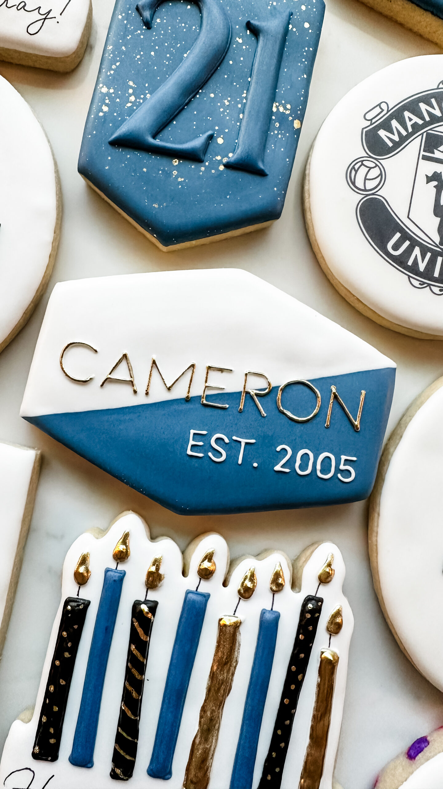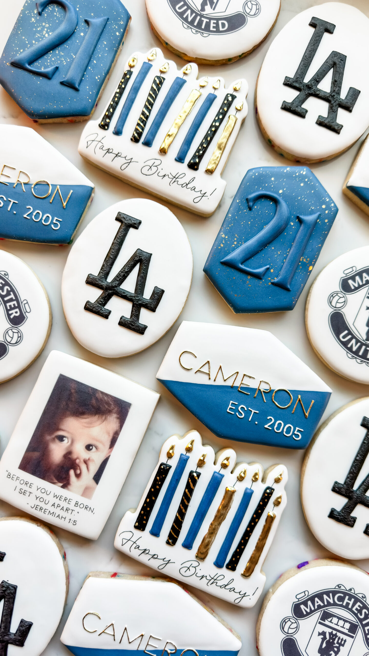 Keywords: Classy, Elegant, Masculine, Men, Manly, Guys, Boys, 21st, Twenty One, Photo, Printed, Polaroid, Baby Picture, Candles, Dodgers, Manchester United, Soccer, Baseball, Favorite Things