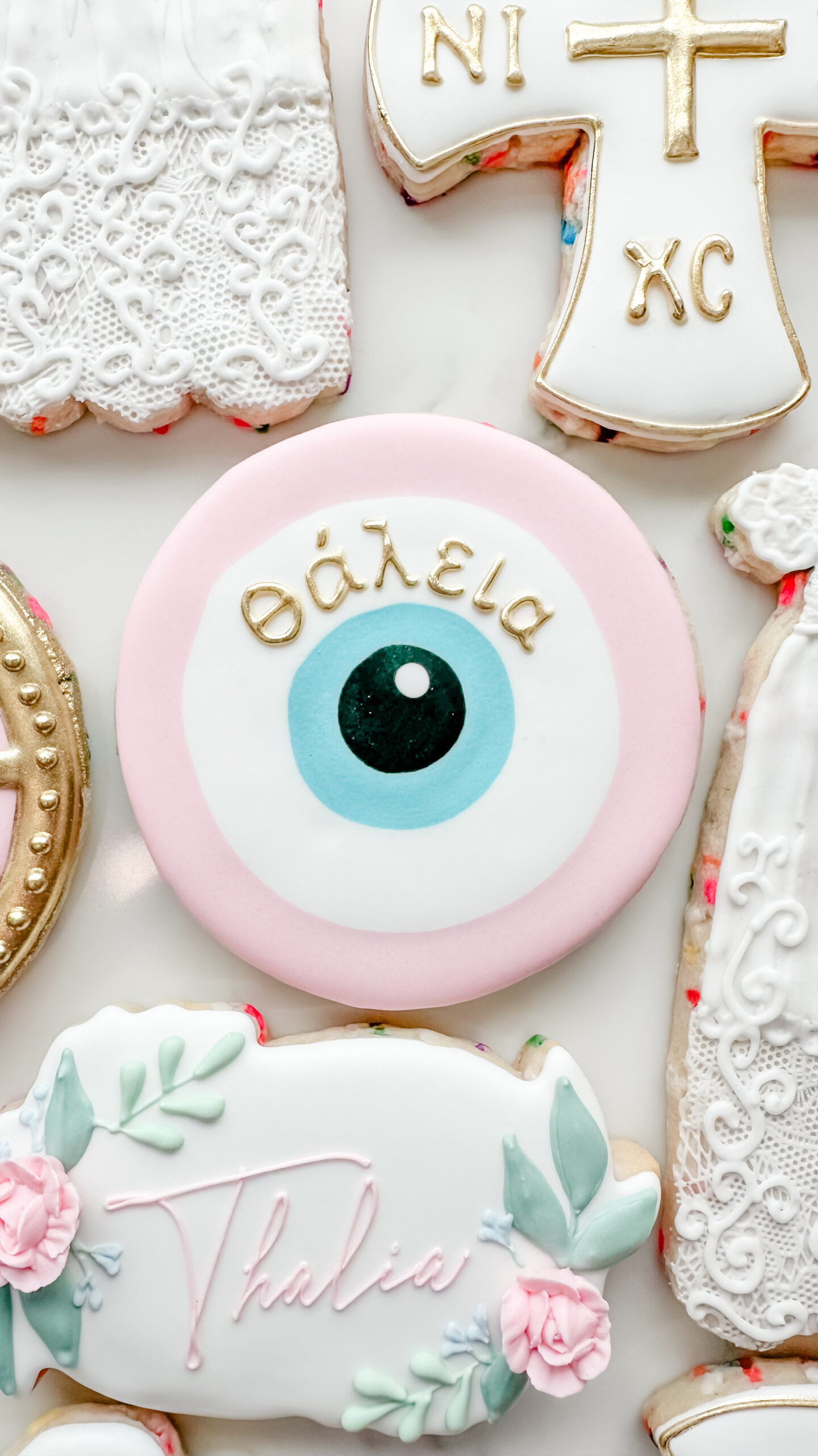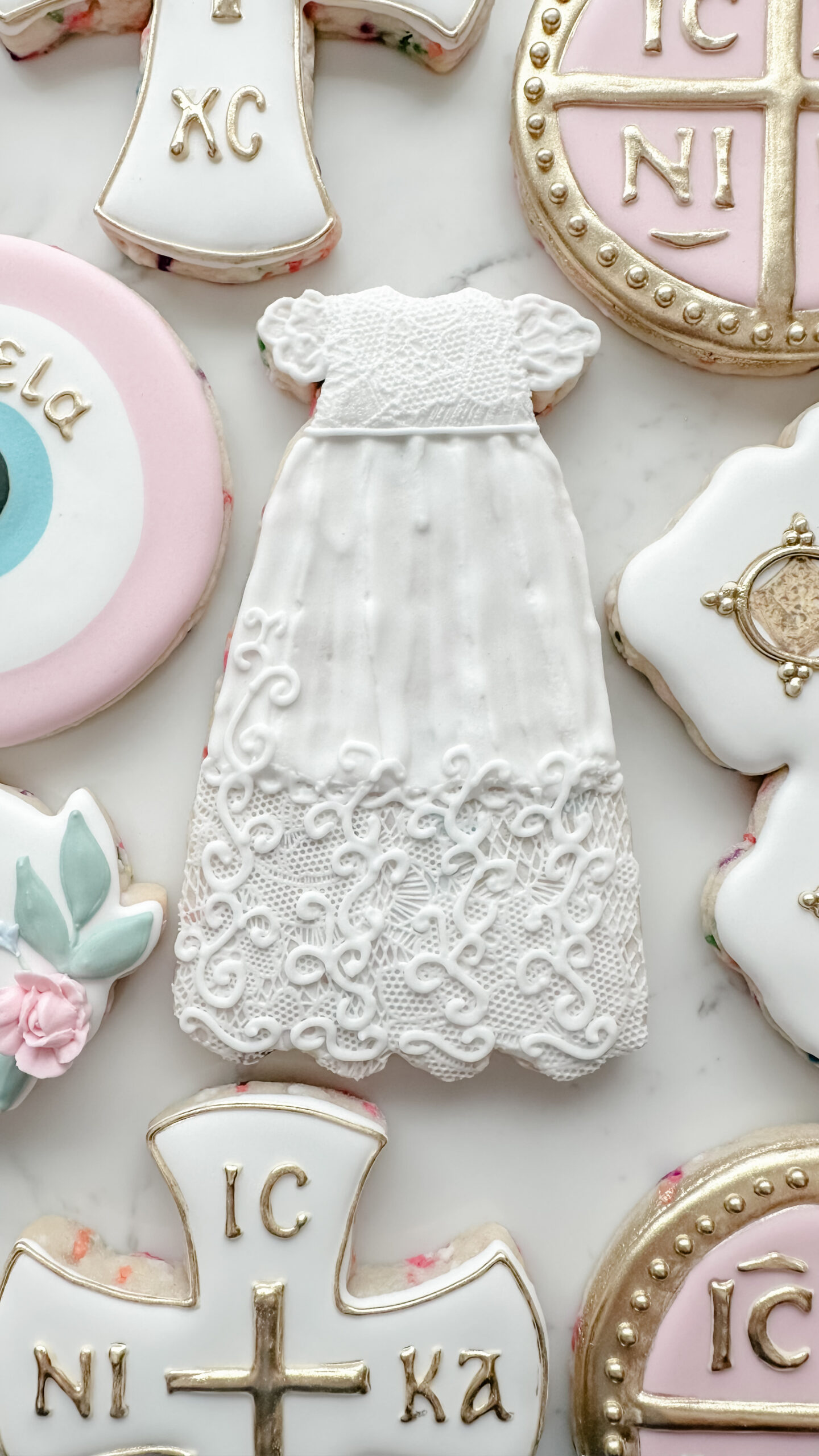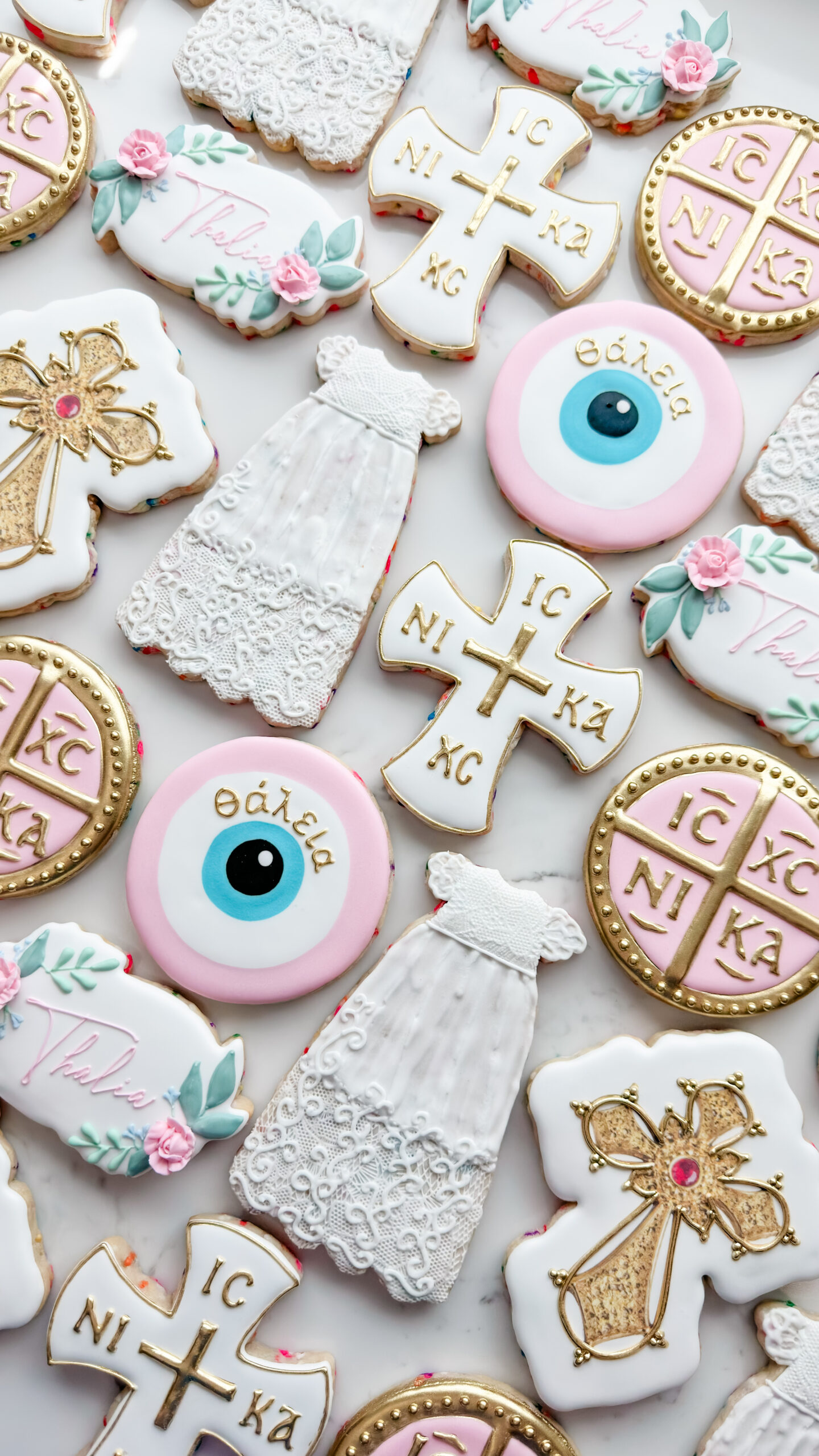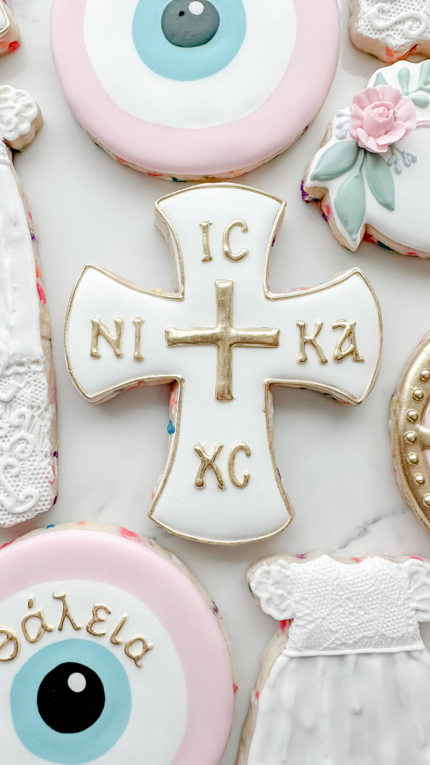 Keywords: Greek, Orthodox, Baptism, Martyrika, Witness Pin, Cross, Floral, Flowers, Dress, Lace, Evil Eye, Hand painted, Gold, Religious