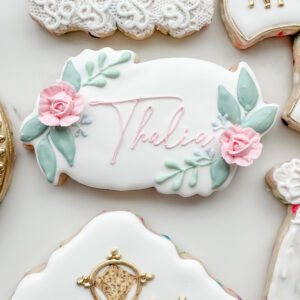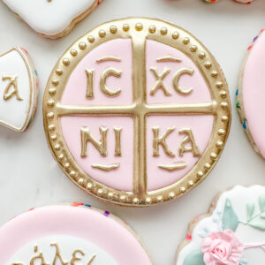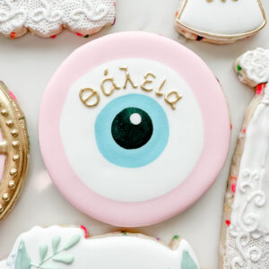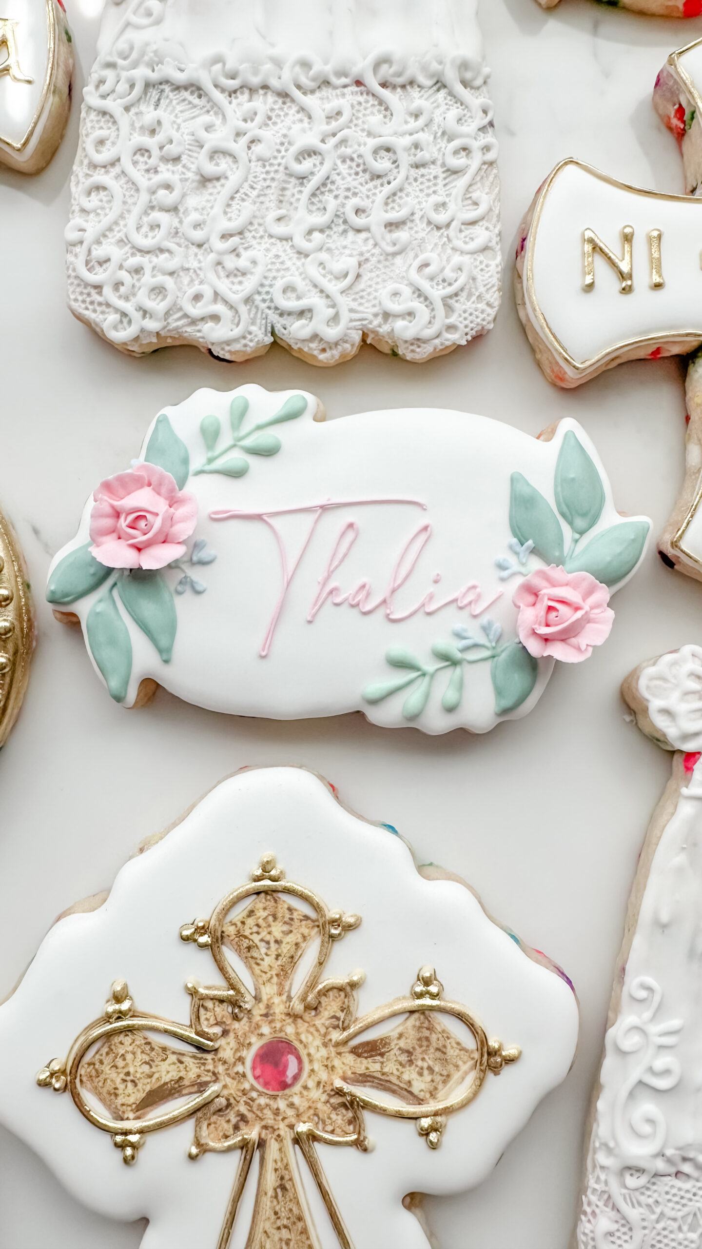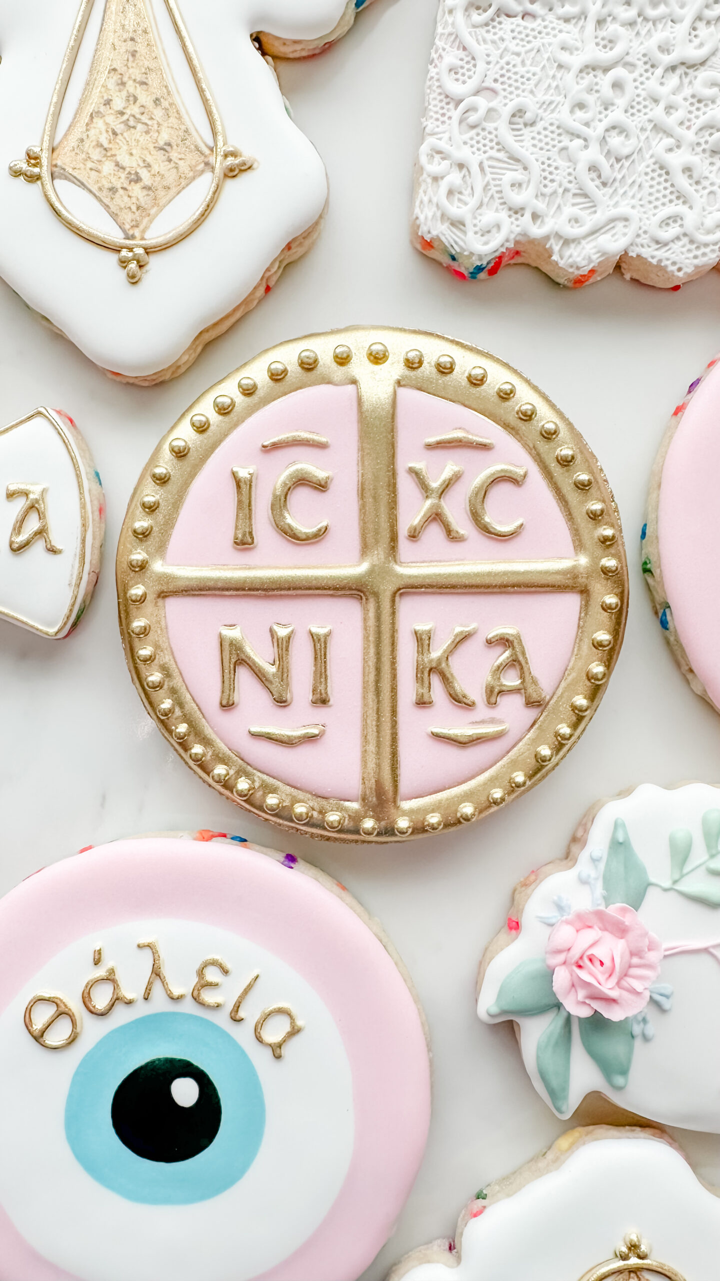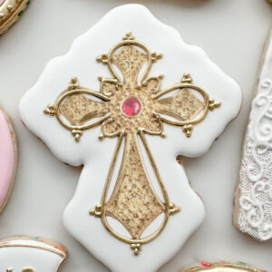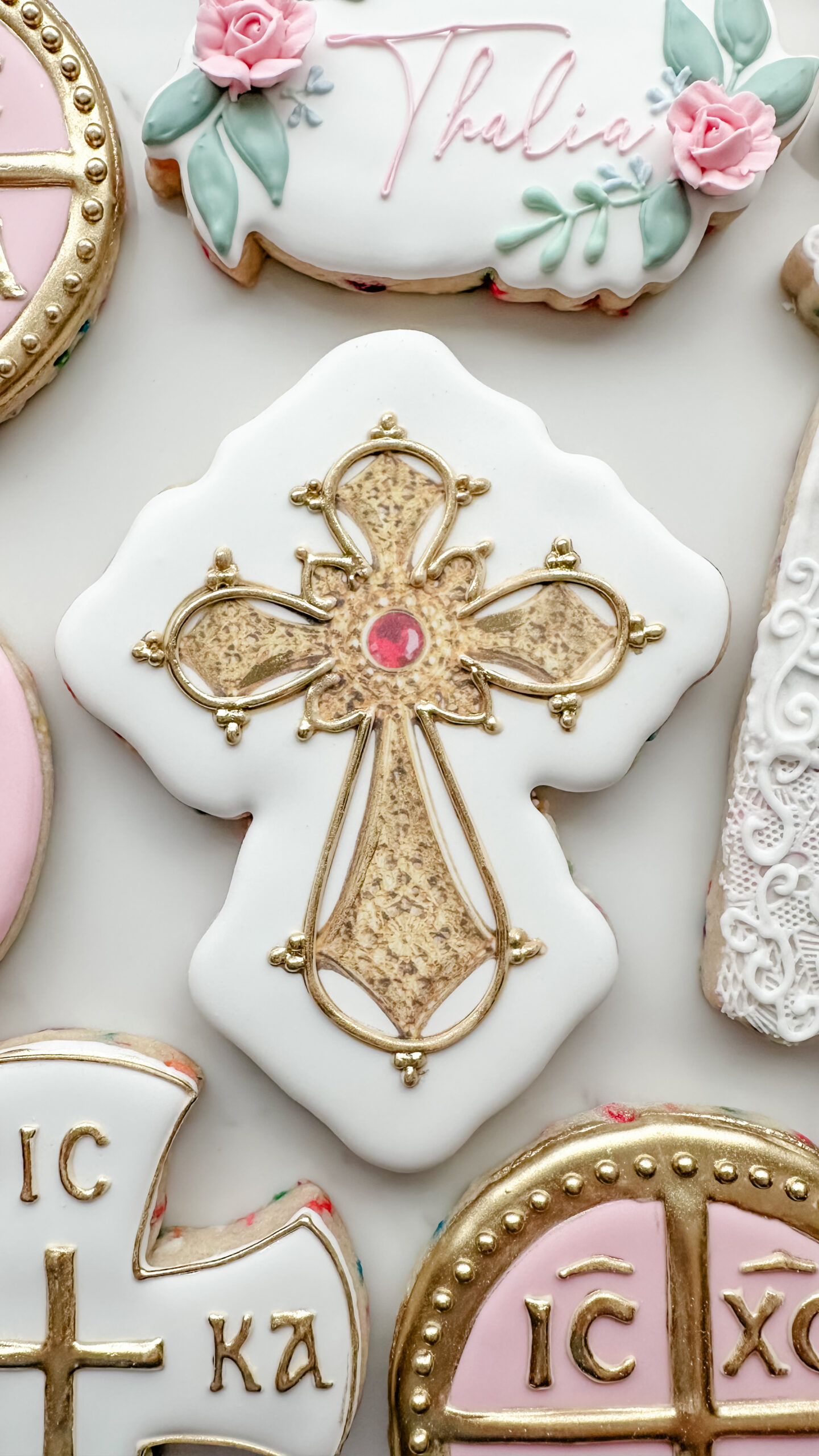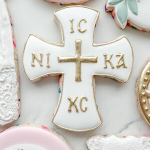 Keywords: Greek, Orthodox, Baptism, Martyrika, Witness Pin, Cross, Floral, Flowers, Dress, Lace, Evil Eye, Hand painted, Gold, Religious