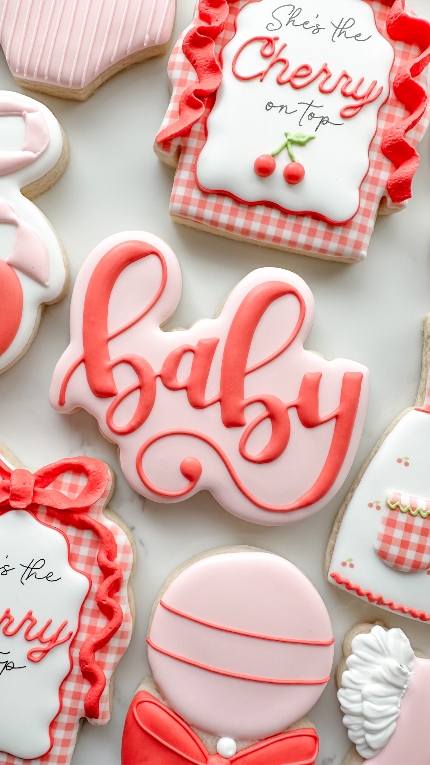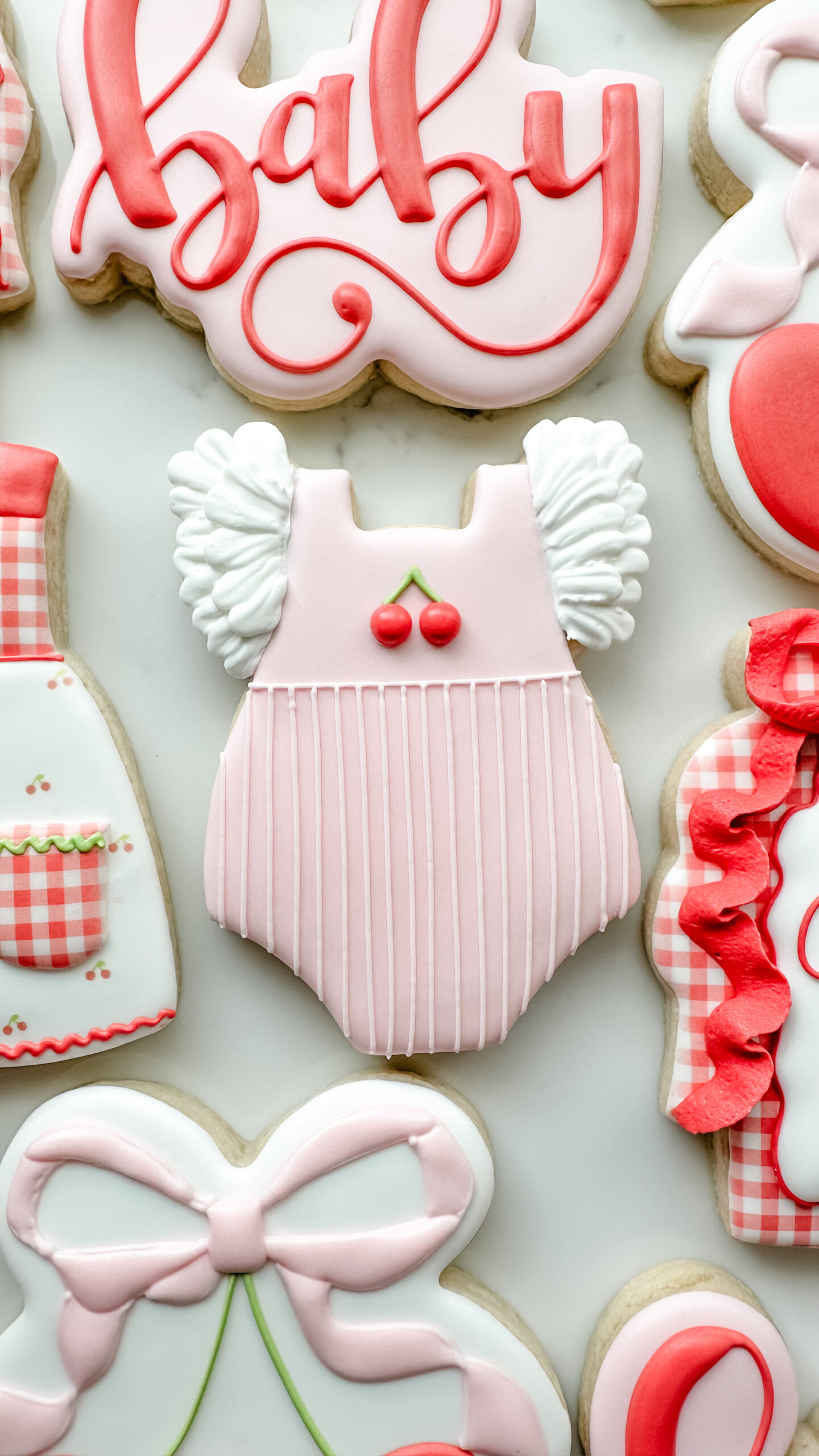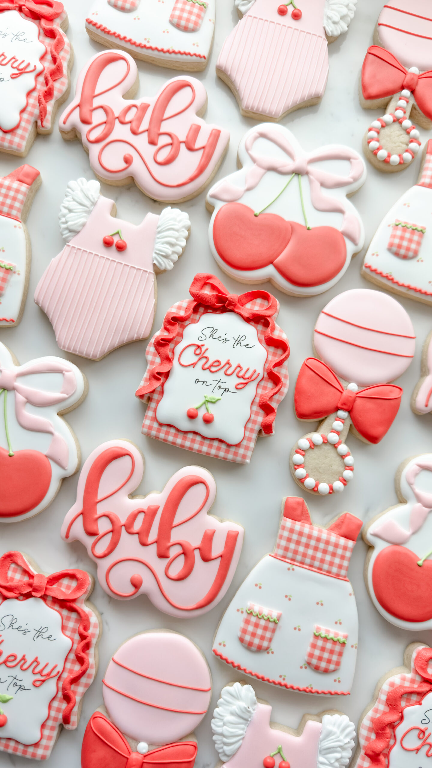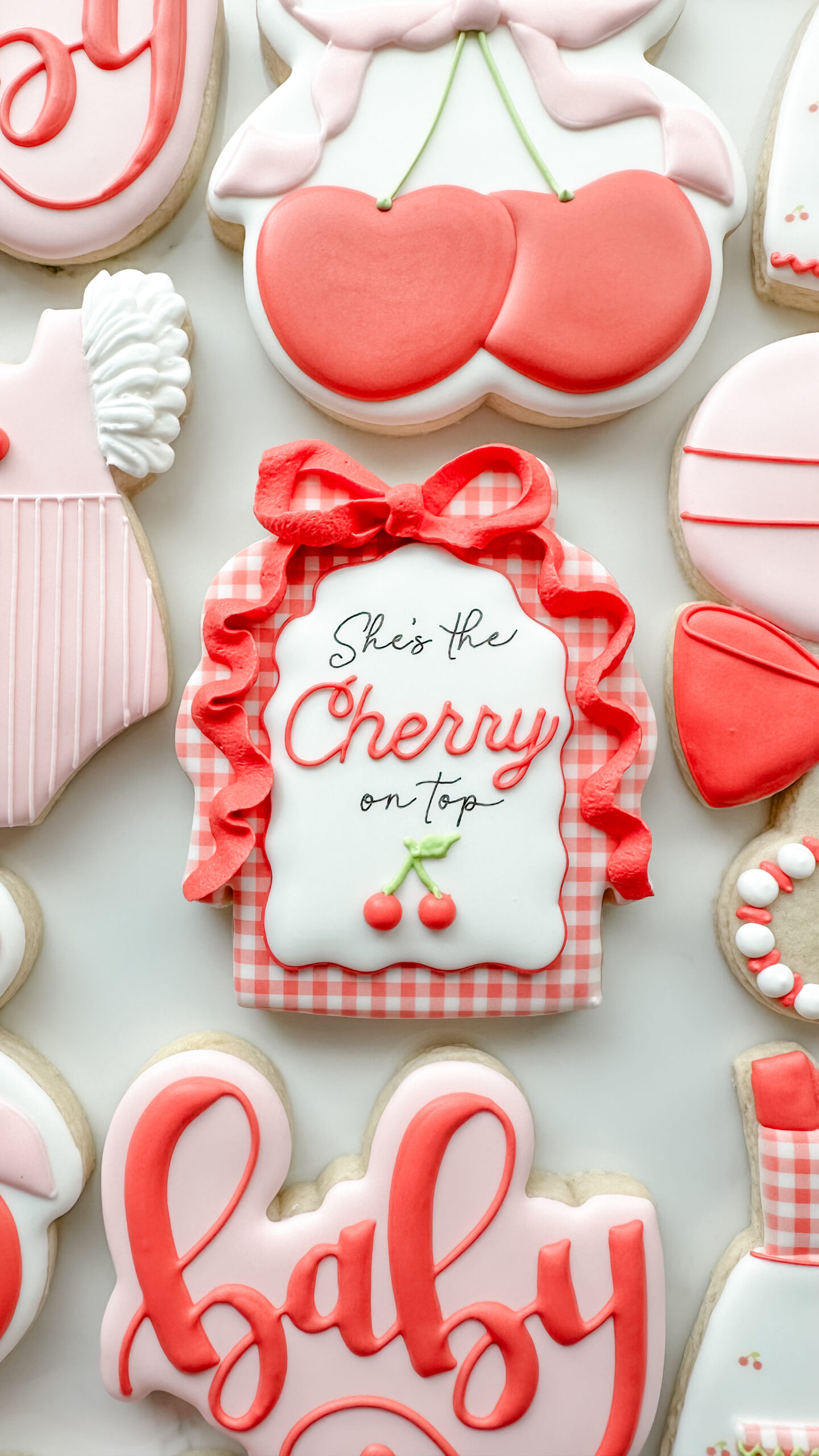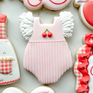 Keywords: Cherry, Cherries, Baby, Plaque, Ribbon, Bows, Gingham, Rattle, Onesie, Dress, Apron, Red, Pink, Girl, Vintage