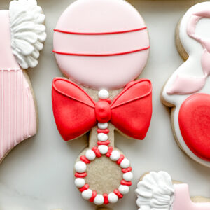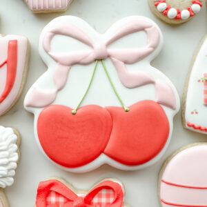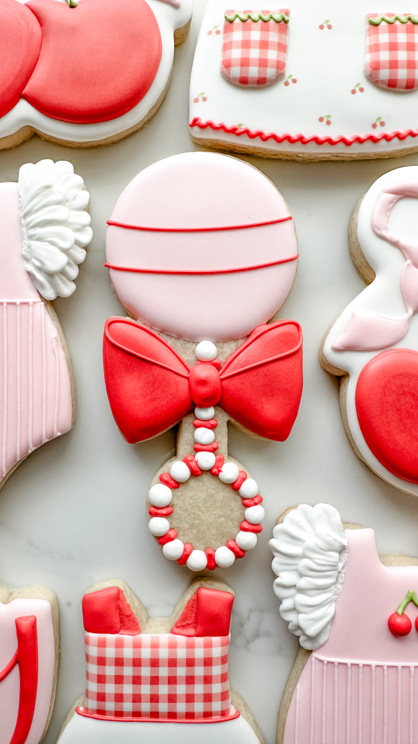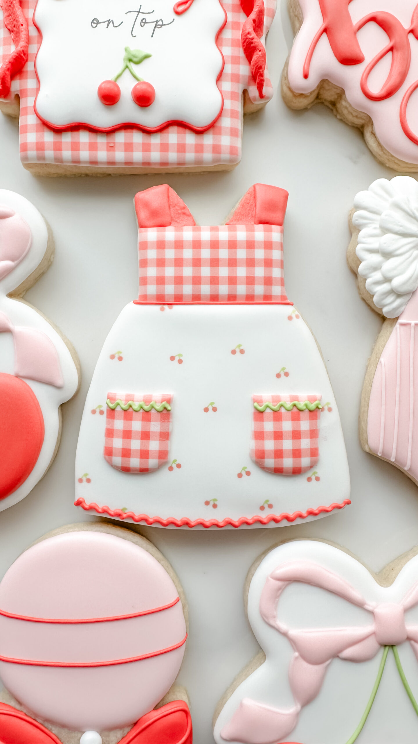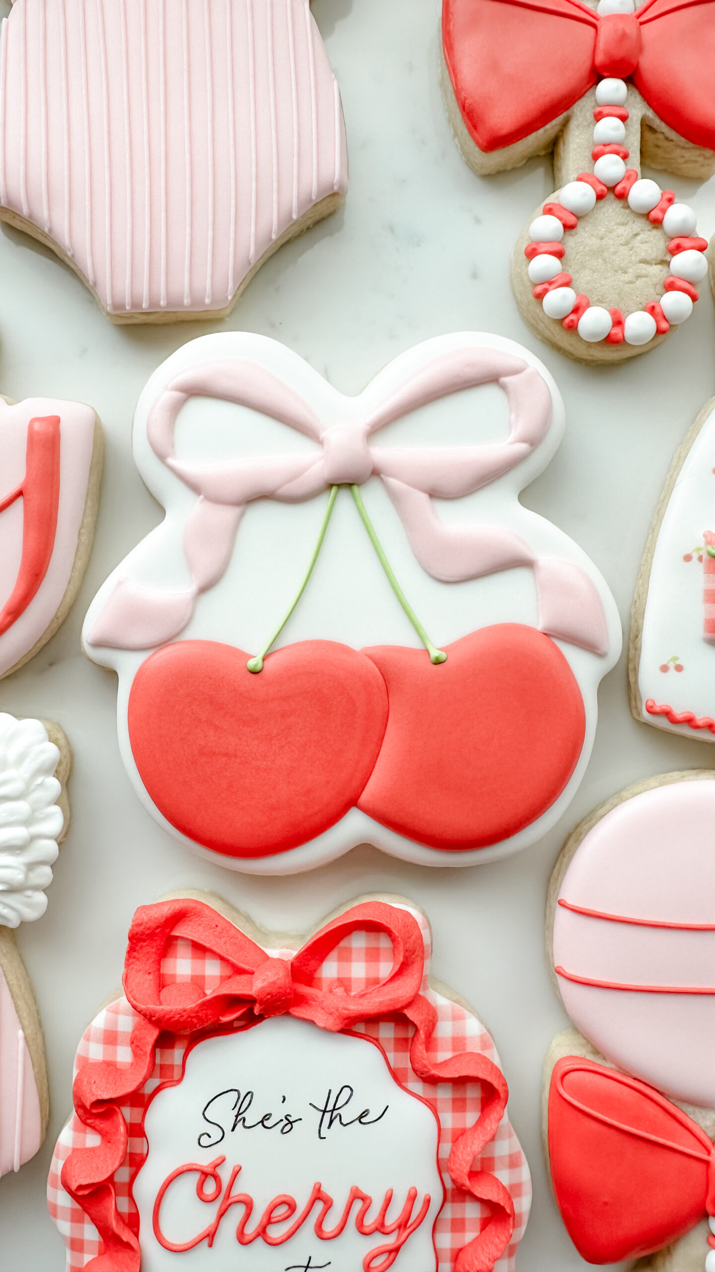 Keywords: Cherry, Cherries, Baby, Plaque, Ribbon, Bows, Gingham, Rattle, Onesie, Dress, Apron, Red, Pink, Girl, Vintage